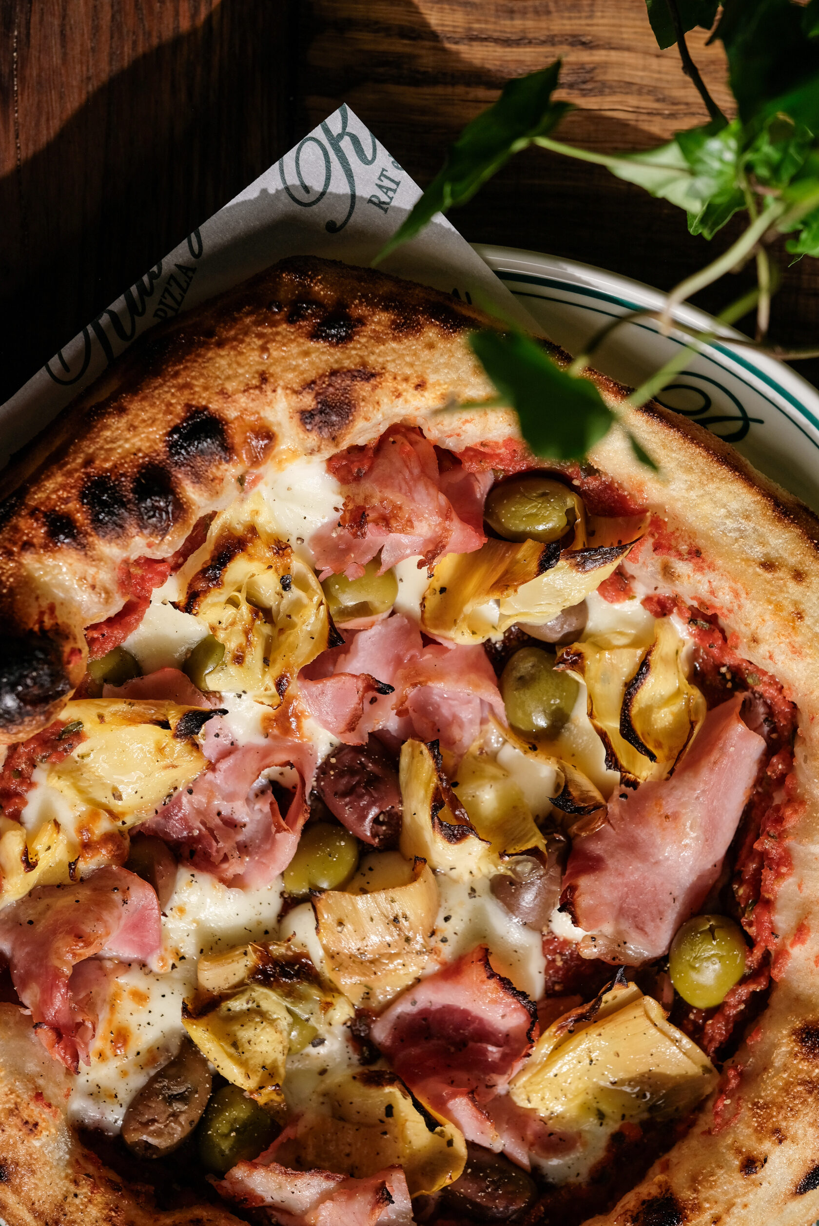 Томатная основа, моцарелла, Тамбовский окорок, Таджасские оливки, артишок