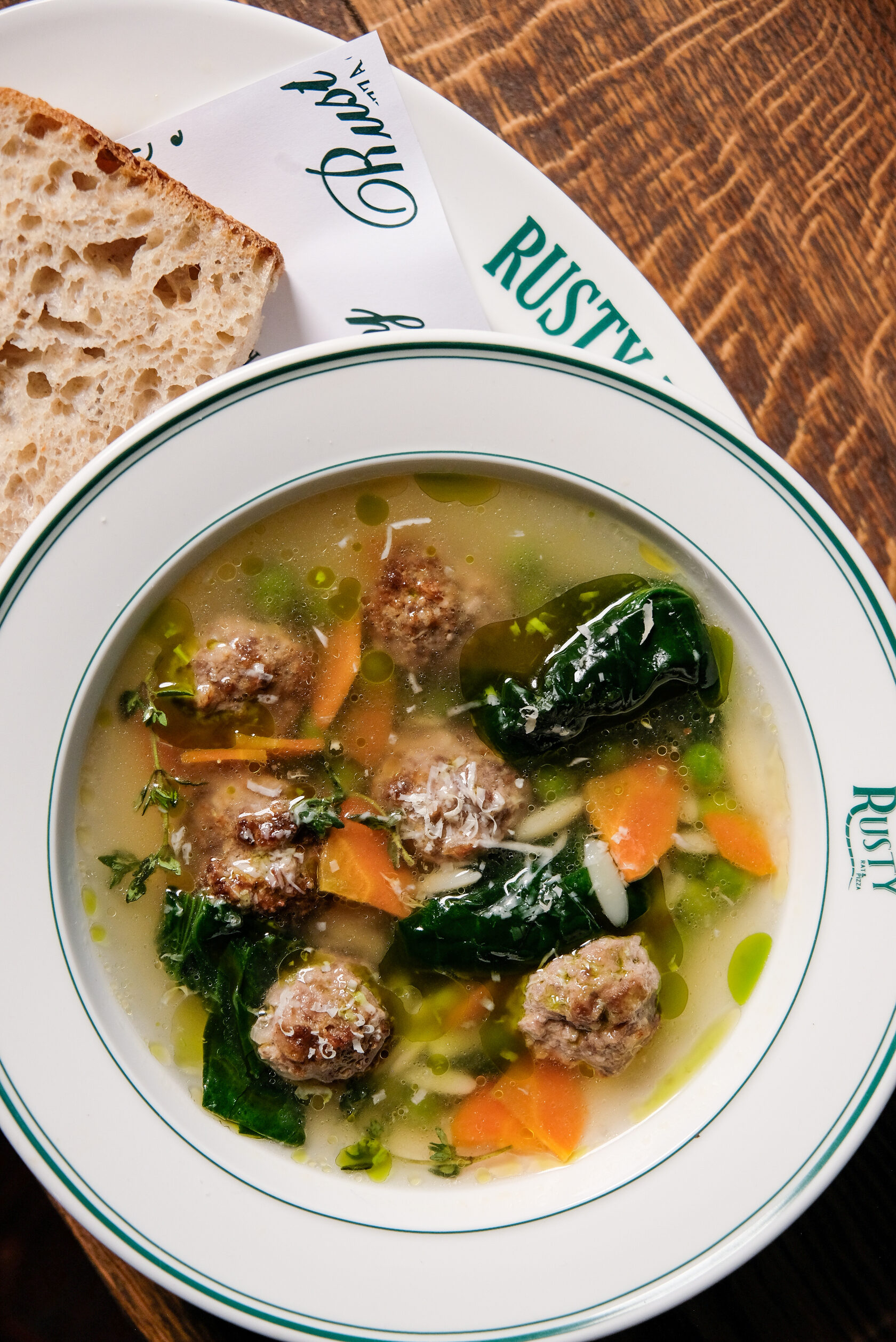 Куриный бульон, овощи, паста орзо, митболы из говядины, пармезан