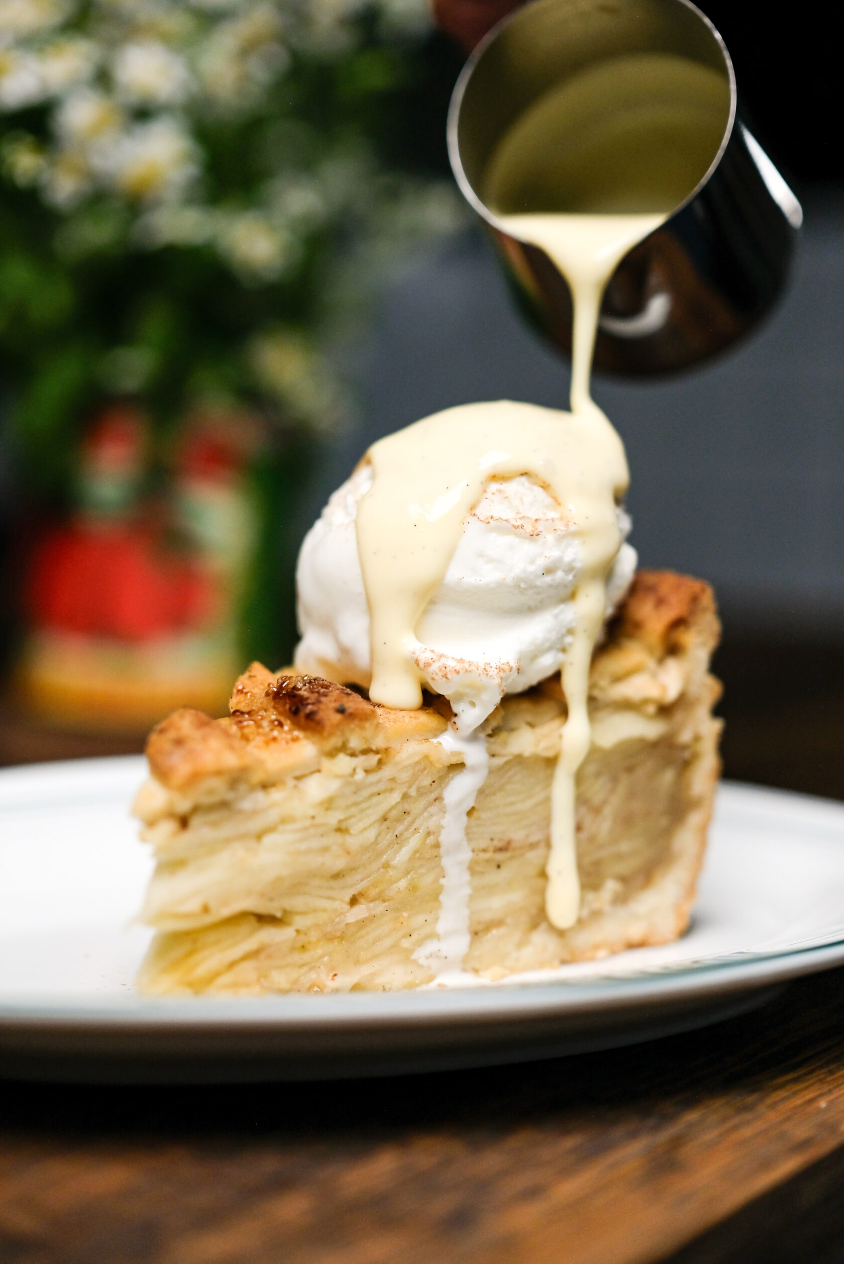 Яблочный пирог, мороженое, ванильный соус