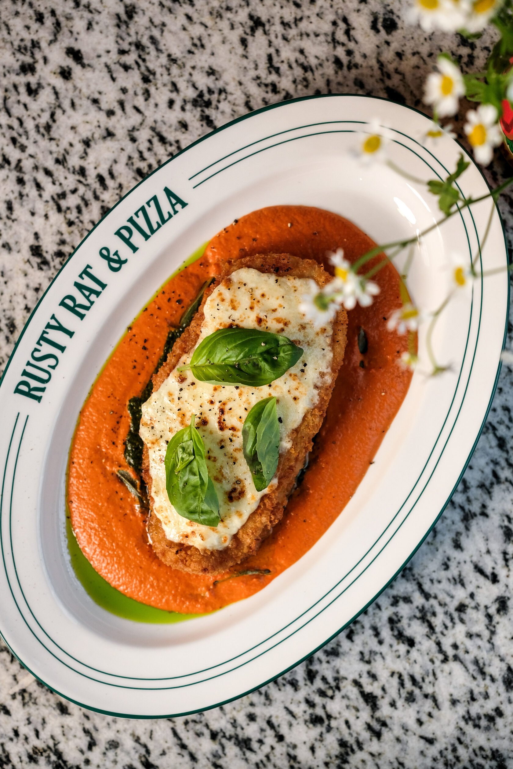 Куриный шницель, запеченный под сыром, соус Алла Водка, песто