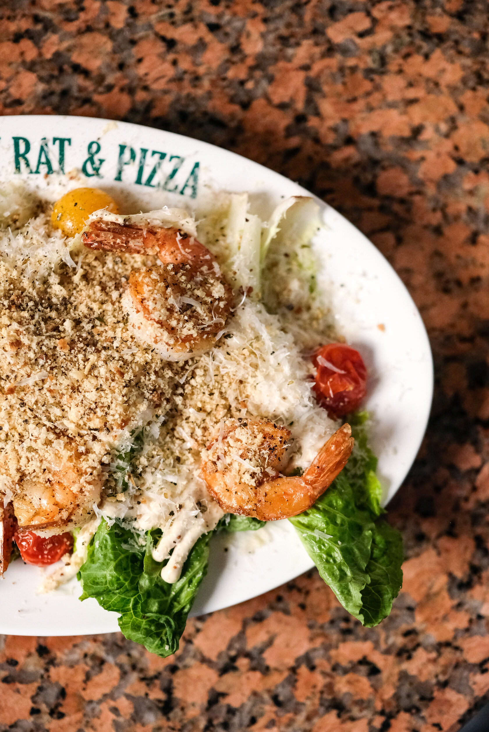 Листья романо, пармезан, томаты конфи, креветки