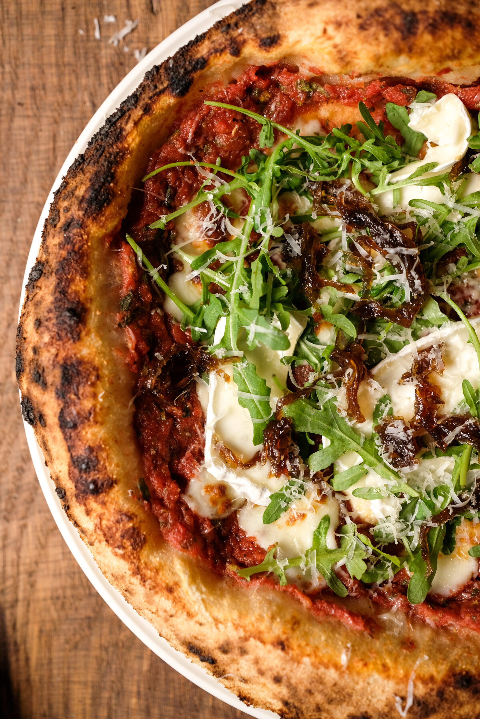 Томатная основа, луковый джем, сыр бри, руккола