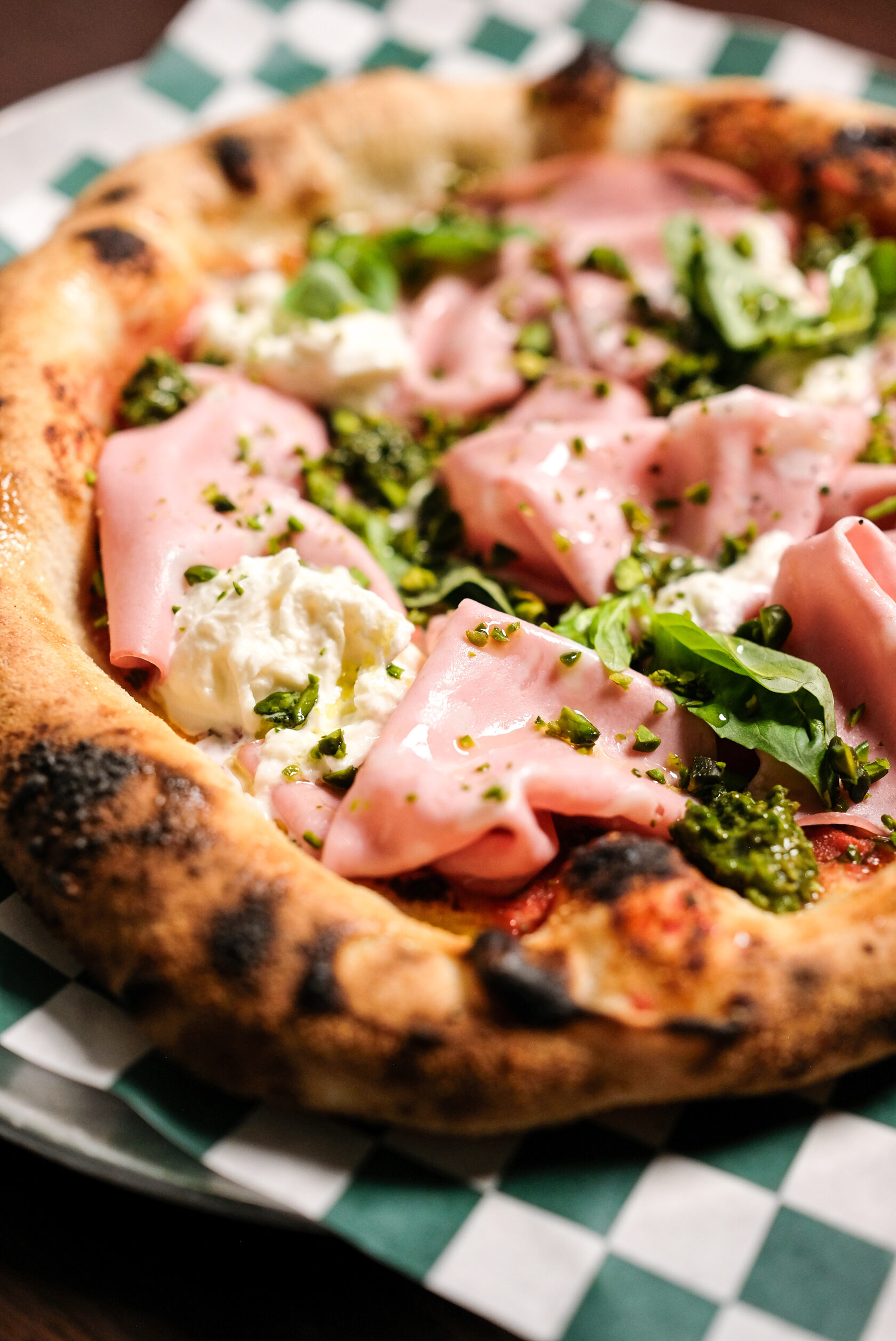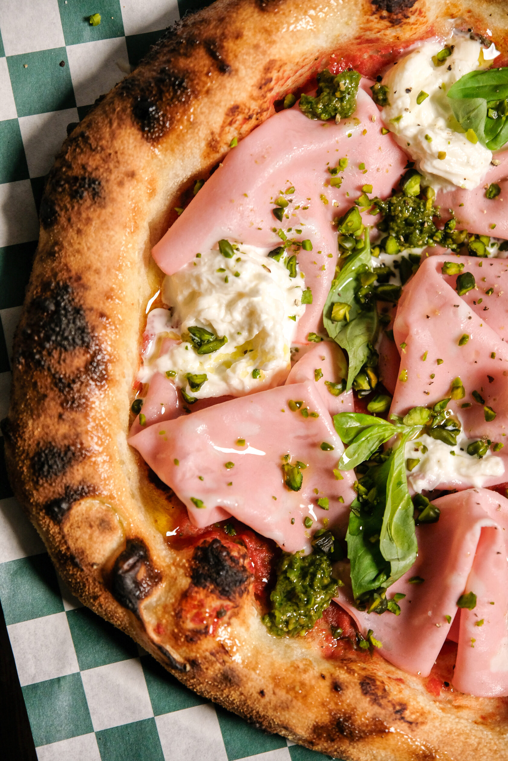 Томатная основа, мортаделла, страчателла, фисташки, песто