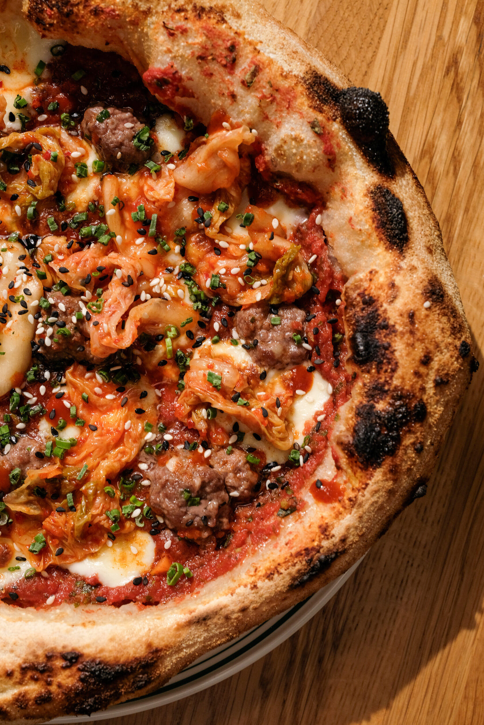 Томатная основа, моцарелла, кимчи, фарш из говядины, кочудян, кунжут
