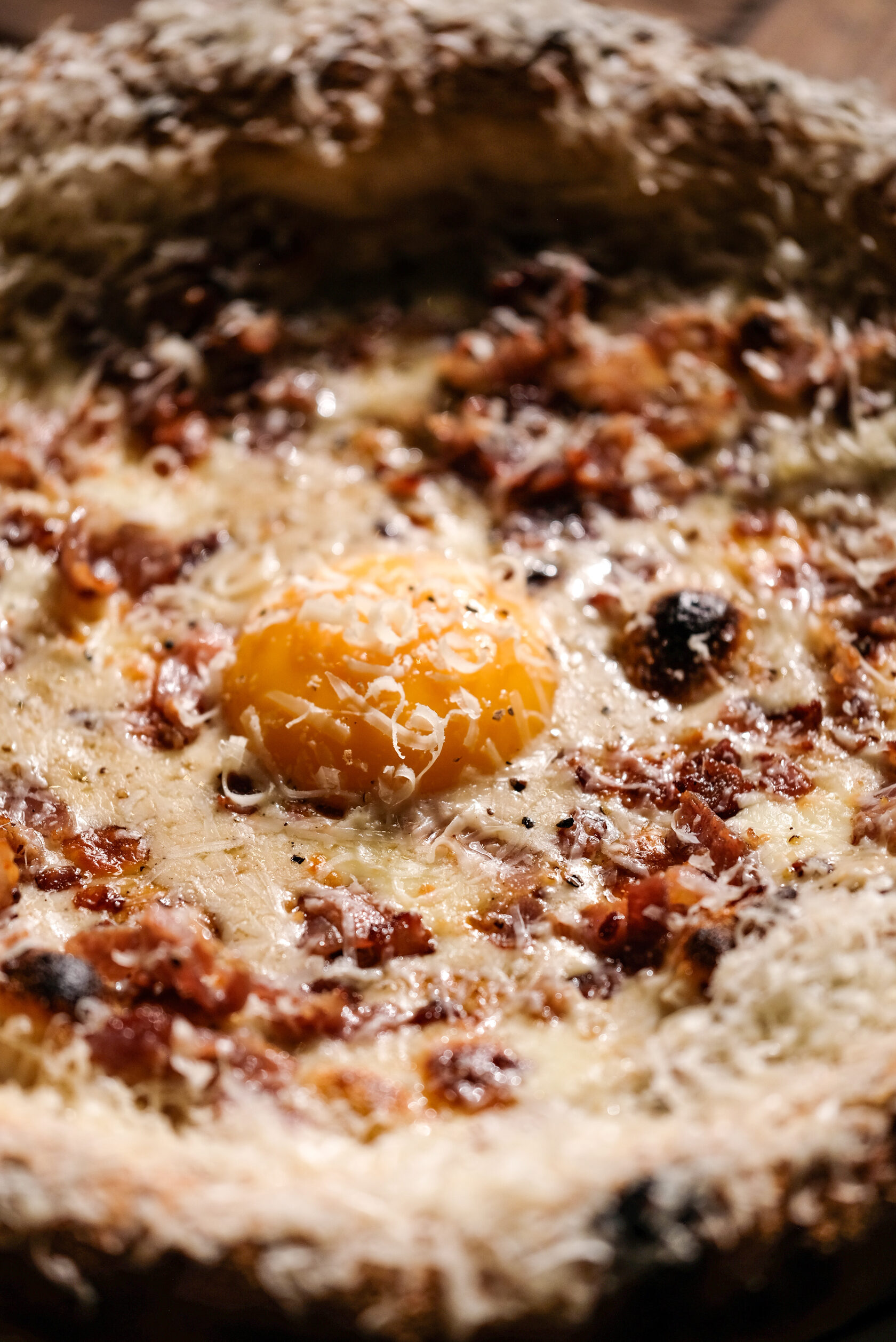 Cоус Качо-э-пепе, моцарелла, свиная грудинка, желток, пекорино