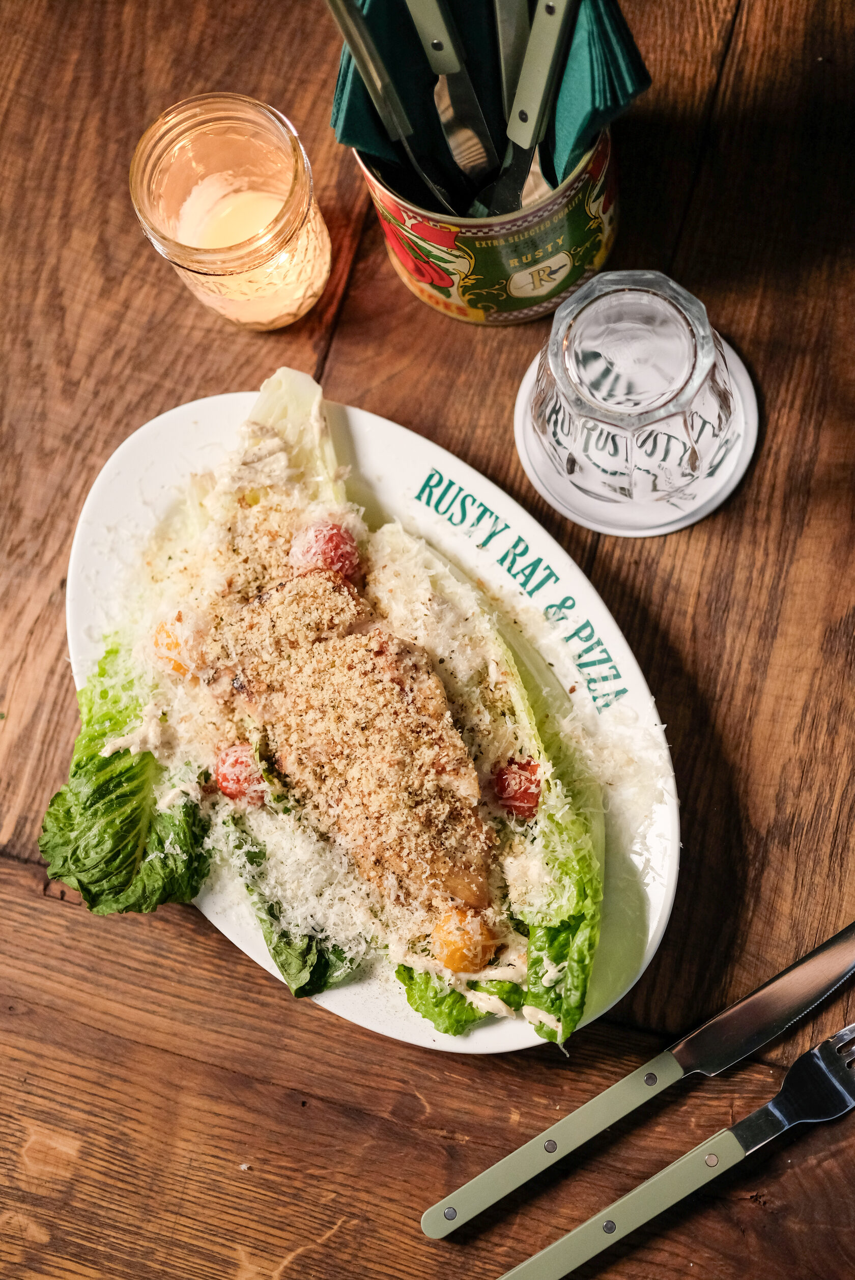 Листья романо, пармезан, томаты конфи, цыпленок