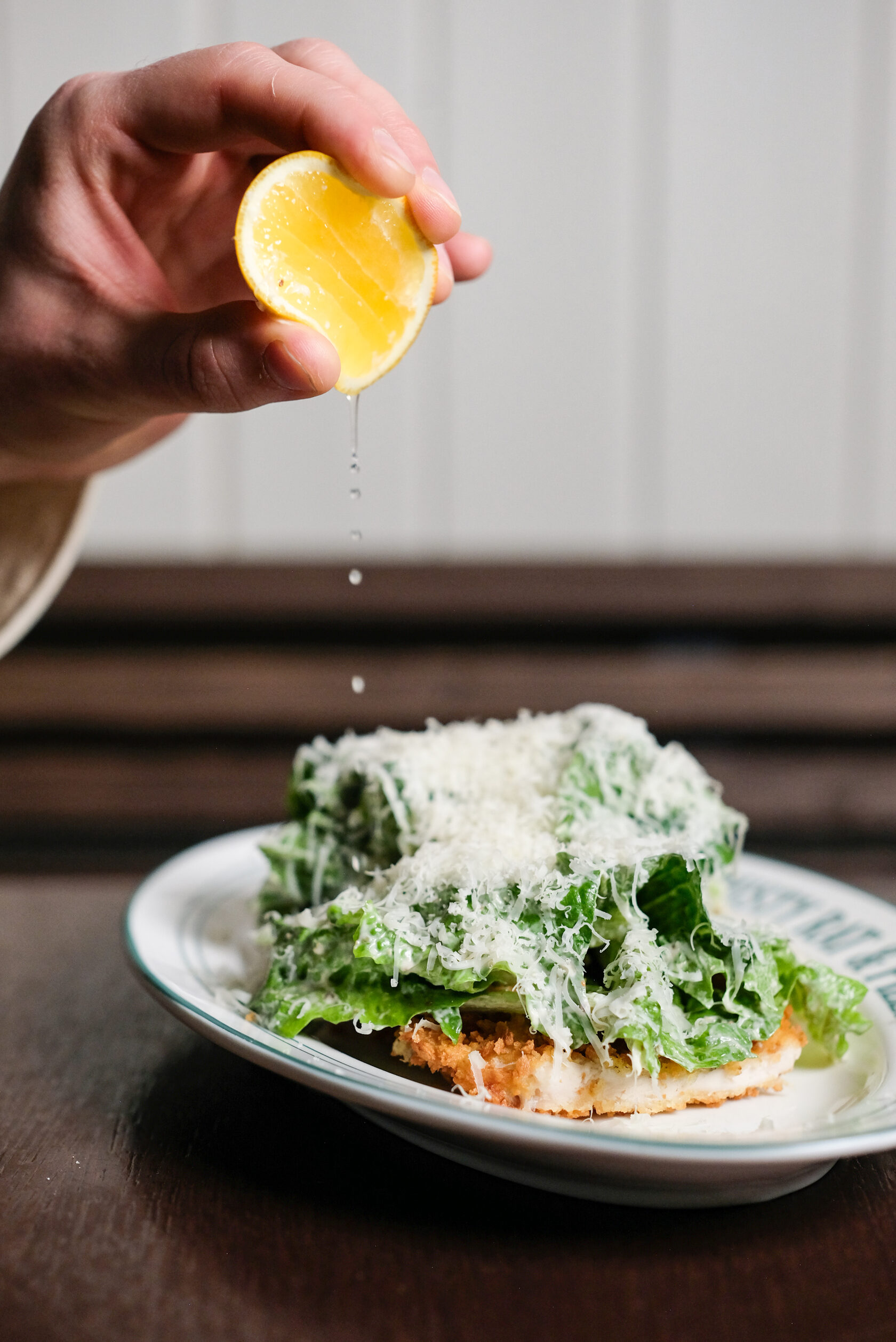 Куриный шницель, салат романо, соус цезарь, пармезан